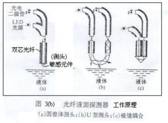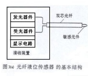 圖3(a)所示為光纖液位傳感器的基本結(jié)構(gòu)。這種傳感器的敏感元件和傳輸信號(hào)的光纖均由玻璃纖維構(gòu)成,故有絕緣性能好和抗電磁噪聲等優(yōu)點(diǎn)。