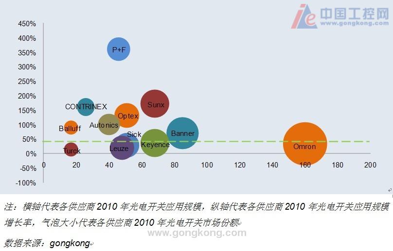從廠商角度來(lái)看,各主流廠商表現(xiàn)的差異非常大。部分廠商,如Autonics、IFM光電開關(guān)和接近開關(guān)銷售業(yè)績(jī)的增長(zhǎng)幅度在100%以上,而還有部分廠商增長(zhǎng)只有10%左右。相比之下,編碼器的主流廠商業(yè)績(jī)?cè)鲩L(zhǎng)幅度雖然也有差距,但是差距相對(duì)較小,增長(zhǎng)幅度最大的為60%,增長(zhǎng)幅度最小的低于10%。但這些變化未改變傳感器市場(chǎng)的整體格局,Omron以全面的產(chǎn)品系列和普遍的實(shí)用性立足于大眾化市場(chǎng),市場(chǎng)份額仍遙遙領(lǐng)先于其他企業(yè)。歐美系品牌中,Turck、Sick和Banner定位于高端市場(chǎng),以先進(jìn)的技術(shù)和穩(wěn)定的質(zhì)量贏得冶金、汽車、物流等高端客戶的青睞。