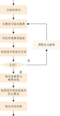 壓電式爆震傳感器的線性度檢測(cè)主要通過連續(xù)改變振臺(tái)的振動(dòng)頻率,即采用掃頻的方式,將振臺(tái)的振動(dòng)加速度穩(wěn)定在設(shè)定范圍內(nèi),對(duì)各個(gè)頻率下的傳感器靈敏度進(jìn)行檢測(cè),輸出各個(gè)靈敏度與頻率相對(duì)應(yīng)的連續(xù)曲線,并檢測(cè)該曲線是否符合該傳感器產(chǎn)品的線性度要求,其測(cè)試流程如圖1所示。