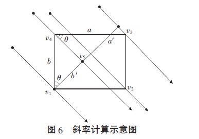 同時初始設(shè)置時可以根據(jù)虛擬觸摸屏的長寬和每個棋盤格在圖像上的投影確定攝像頭拍攝的每個棋盤格平行光的斜率。放大圖5 中的棋盤格s,得到圖6。假設(shè)攝像頭c1以斜率k平行拍攝由頂點v1、v2、v3、v4組成的棋盤格s,其邊(v4,v3)的長度為a,在圖像平面上的投影(v3,v5)的長度為a′,其邊(v1,v4)的長度為b,在圖像平面的投影(v1,v5)的長度為b′。已知虛擬觸摸屏的長寬,每個棋盤格的長a 和寬b 分別為其1/n,a′、b′可從拍攝的圖像上獲得,于是從攝像頭拍攝該棋盤格的平行光的斜率k 可由下式獲得: