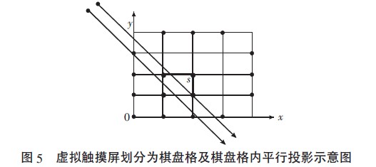 具體實施中,為準(zhǔn)確識別手指位置,將虛擬觸摸屏劃分為n×n 的棋盤格,如圖5 所示,由于攝像頭離棋盤格距離較遠,且每個棋盤格足夠小,于是可以假設(shè)在棋盤格內(nèi),攝像頭拍攝的光線是平行的,以簡化點位置的轉(zhuǎn)換。