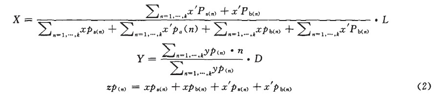 其中Cn代表第九組電極的Cp。n代表電極的組數(shù),L是電極寬,D是一組電極的高。其X坐標(biāo)的計算是通過左側(cè)通道的感應(yīng)值加和與右側(cè)通道感應(yīng)值加和的比例來計算的。y是通過同一行的左右兩通道感應(yīng)值的加和與上下行的感應(yīng)值加和的比例來計算的。具體計算方法由式(1)確定: