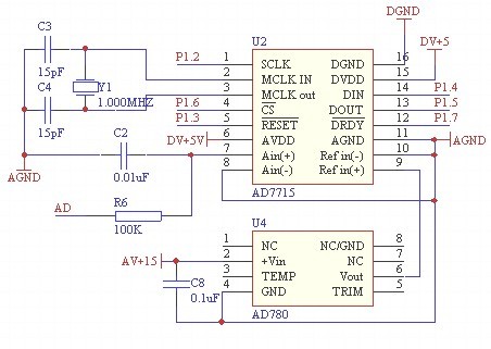 為了實現(xiàn)對微壓力的實時測量,使用 16 位的AD7715 對輸出電壓進行采樣測量,其中AD780 提供2.5V 高精度基準電壓。P3.1 腳提供了AD 工作所需的時鐘,P1.4 和P1.5 腳接收和發(fā)送通訊數(shù)據(jù),P1.6 是片選信號,P1.7 接DRDY ,AT89S52 可以通過查詢P1.7 的狀態(tài)來判斷是否可以讀取AD 轉(zhuǎn)換結(jié)果。A/D 接口電路如圖3所示。