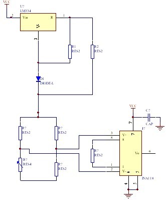 本文采用惠斯通電橋濾出微壓力傳感器輸出的模擬變量,然后用INA118放大器將此信號放大,用7715A/D 進行模數(shù)轉(zhuǎn)換,將轉(zhuǎn)換完成的數(shù)字量經(jīng)單片機處理,最后由LCD 將其顯示,采用LM334 做的精密5 V 恒流源為電橋電路供電,完成了微壓力傳感器接口電路設(shè)計,既能保證檢測的實時性,也能提高測量精度。