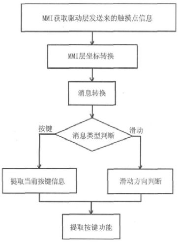 如圖6 所示,在獲得觸摸點(diǎn)消息后,系統(tǒng)MMI 層調(diào)用MMI 層坐標(biāo)轉(zhuǎn)換函數(shù)提取驅(qū)動層發(fā)送的觸摸點(diǎn)位置信息,并轉(zhuǎn)化為MMI 層的位置信息。當(dāng)有觸摸操作進(jìn)行時,底層驅(qū)動程序向MMI 層發(fā)送觸摸點(diǎn)的位置信息。在獲得驅(qū)動層觸摸點(diǎn)信息后,系統(tǒng)MMI 層調(diào)用MMI 層坐標(biāo)轉(zhuǎn)換函數(shù)提取驅(qū)動層發(fā)送的觸摸點(diǎn)位置信息,并轉(zhuǎn)化為MMI 層的位置信息。如果系統(tǒng)所發(fā)事件是按下事件(MMI_PEN_EVENT_DOWN),系統(tǒng)根據(jù)觸摸點(diǎn)坐標(biāo)調(diào)用當(dāng)前按鍵信息提取函數(shù)獲得被選按鍵信息;如果是滑動事件(MMI_PEN_EVENT_MOVE),則進(jìn)行滑動方向判斷。