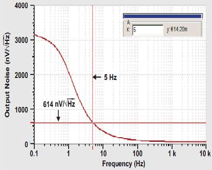 利用圖6所示原始電路,我們使用最初指定的一些噪聲值,可以通過(guò)方程式7再次估算出5Hz的噪聲。