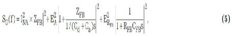 最后,我們需要最大化信噪比(SNR)。在進(jìn)行仿真以前進(jìn)行簡(jiǎn)單的理論噪聲分析會(huì)有所幫助。圖4顯示了電荷放大器的主噪聲源。輸出噪聲譜密度可以表示為:
