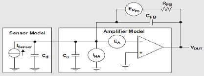 信號(hào)調(diào)節(jié)電路必須具有非低的輸入阻抗,以收集傳感器的大部分電荷輸出。因此,電荷放大器是理想的解決方案,因?yàn)橹灰糯笃髟谶@些信號(hào)頻率下保持高增益,其輸入便會(huì)讓傳感器信號(hào)出現(xiàn)虛擬接地。換句話說(shuō),如果傳感器的任何電荷想要在傳感器陽(yáng)極(Cd)或者放大器輸入寄生電容(Ca)上增大,在放大器輸入端就會(huì)形成電壓。通過(guò)拉或吸取相同量的負(fù)反饋網(wǎng)絡(luò)電荷電流,即RFB和CFB,這種電壓便立即得到了補(bǔ)償。