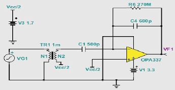 為了獲得更為實(shí)際的電路實(shí)施,我們選用了TI的OPA337.這款放大器擁有低輸入電壓和低輸入電流噪聲(請(qǐng)參見(jiàn)圖5),同時(shí)接受3V單極電源。圖6顯示了TI SPICE型仿真程序中這種電路的模型,即TINA-TI.