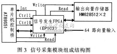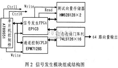 該模塊由單片機控制橋(AT89S51)、測試向量存儲器(靜態(tài)存儲器HM628128x2,排列方式為256 Kx8 bit)、信號發(fā)生FPGA(Altera公司Cyclone系列PLD器件EP1C3)、通道控制CPLD(Altera公司MAX7000系列PLD器件EPM7128S)及三態(tài)選通門陣列(74LS126x16)組成,模塊組成結(jié)構(gòu)如圖2所示。