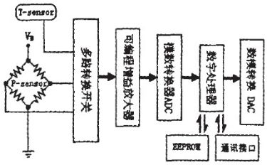 在溫度傳感器的輔助作用下通過(guò)信號(hào)轉(zhuǎn)換開關(guān)分時(shí)讀取壓力與溫度的數(shù)值,通過(guò)可編程增益放大器將微弱信號(hào)放大,再經(jīng)過(guò)ADC量化傳感器的信號(hào)進(jìn)入數(shù)字處理器計(jì)算當(dāng)前溫度和壓力下的補(bǔ)償后壓力輸出給數(shù)模轉(zhuǎn)換DAC輸出模擬信號(hào)。而溫度補(bǔ)償則可以通過(guò)通訊接口將參數(shù)寫入EEPROM供數(shù)字處理器計(jì)算時(shí)調(diào)用。如此多的功能部件均可集成制作在一塊單一芯片上,使得ASIC電路很容易和MEMS技術(shù)制作的壓力敏感芯片封裝在一個(gè)小巧的殼體中。