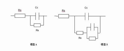 在模型A中電阻器Rs表示金屬所在的溶液,而電容Cc表示金屬表面的保護(hù)涂層或涂料,這表示初始涂層的電容。經(jīng)過一段時間后,水滲入涂層中形成新的液體和金屬界面。隨著金屬的腐蝕,通過溶液與金屬之間的保護(hù)涂層形成離子導(dǎo)電路徑。這可以用Rx與Cc并聯(lián)模型來表示。另外,有些模型(模型B)還有一個附加的R和C并聯(lián)起來再與Rx串聯(lián)的電路來表示金屬保護(hù)涂層隨著時間變化的分層模型。