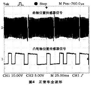 通過圖4還能看出曲軸位置傳感器波形出現(xiàn)2次才與凸輪軸位置傳感器波形重合一次起始位置,這種關(guān)系和本車曲軸轉(zhuǎn)速與凸輪軸轉(zhuǎn)速比為2:1的關(guān)系一致,也正好是1缸上止點(diǎn)的位置,也就是1缸點(diǎn)火正時(shí)的基準(zhǔn)位置,也決定了其它3個(gè)缸的點(diǎn)火時(shí)刻。此信號傳輸給腳,ECU就能發(fā)出點(diǎn)火信號,起動(dòng)發(fā)動(dòng)機(jī)。否則ECU就不發(fā)出點(diǎn)火信號,發(fā)動(dòng)機(jī)不能起動(dòng)。