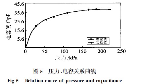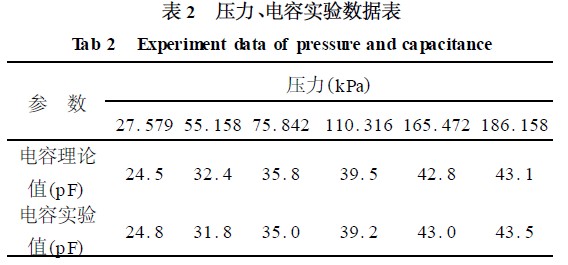 從表1 可見,擬合的電容誤差小于1 %。由此可見,在不同的時刻測得UO ( t) ,通過曲線擬合得出參數(shù)RC。再給電路加小信號直流電源,測出R 值,即求得C ,通過C 值則可知被測環(huán)境的壓力。圖5為350 ℃時,不同的壓力所對應的電容的理論值和實驗值,從實驗數(shù)據(jù)(表2) 可得,在測壓的過程中,利用模型識別的方法,誤差較小,其測壓誤差小于2 %。