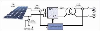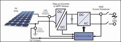 通常在剛好在PV 方陣后使用最大功率點跟蹤(MPPT)組件來確保方陣工作在其最大功率運行水平。通過使用用于跟蹤功能的電流和電壓傳感器,應(yīng)用一種特殊軟件算法和專用電子元件一起來控制電池板(電池)的工作點。一般來說,一臺電流傳感器可用于測量單相輸出(供到電網(wǎng)的電流),而另一臺傳感器可用于測量輸入直流電流(10-25A)。在三相輸出的情況下,兩臺傳感器可用于測量三相輸出的交流電流。接入電網(wǎng)的DC/AC逆變器是一臺將直流信號轉(zhuǎn)換為正弦波的全橋逆變器。