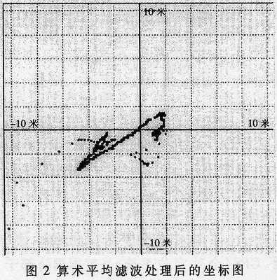圖2、圖3、圖4分別是對利用Visual Basic6.0開發(fā)的數(shù)據采集與處理程序采集的10小時GPS數(shù)據進行幾種數(shù)據處理后的坐標示意圖(其中,橫坐標、縱坐標分別表示經、緯度)。從這三個圖中可以看出,從圖2到圖4,數(shù)據收斂性依次增強,可見綜合幾種濾波法于數(shù)據處理中,將大大減少誤差,提高系統(tǒng)精度。