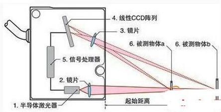激光發(fā)射器通過鏡頭將可見紅色激光射向物體表面,經(jīng)物體反射的激光通過接受器鏡頭,被內(nèi)部的CCD線性相機(jī)接受,根據(jù)不同的距離,CCD線性相機(jī)可以在不同的角度下“看見”這個(gè)光點(diǎn)。根據(jù)這個(gè)角度即知的激光和相機(jī)之間的距離,數(shù)字信號(hào)處理器就能計(jì)算出傳感器和被測(cè)物之間的距離。