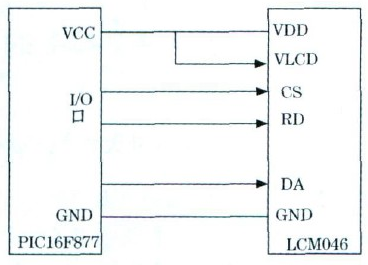 控制顯示電路以單片機為核心, 選用PIC16F877單片機為控制器, 其內(nèi)部含有10位高精度A /D轉(zhuǎn)化器, 能夠直接處理模擬電壓, 調(diào)整CAV424的GLP , 可以使輸出電壓范圍在2 5~ 35V 之間, 滿足單片處理信號的要求。顯示器件選用LCM 046液晶模塊, 其功耗低, 工作電流只有μA級, 并且其與處理器連接簡單。連接圖如圖4所示。