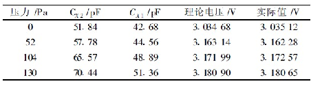 試驗中差動式電容傳感器的低壓端連接CAV424的C X2管腳, 高壓端連接C X1管腳。根據(jù)差動電容值的變化范圍, Cosc這里取82 pF, 則fOSC = 29. 036 kH z;GLP = 1 +RL1/RL2中的RL 1, RL2分別取300Ω 和100 Ω , 這樣使得CAV424輸出的電壓范圍在25~3 75 V, 在ADC 模擬輸入范圍內(nèi)。試驗中選取兩種量程的電容傳感器作為實驗的測試對象, 分別是130 Pa 和10M Pa 兩種。
