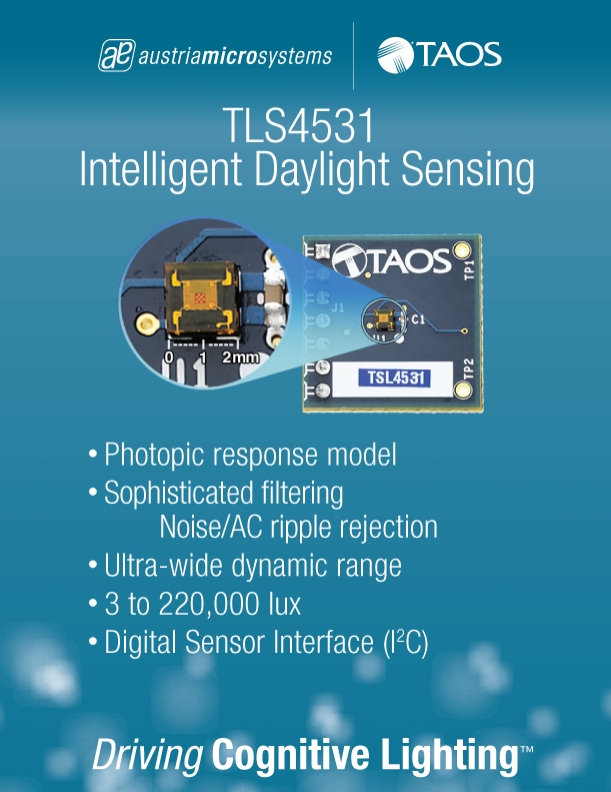 新的傳感器系列由2011年被奧地利微電子收購的全球領先智能照明傳感器提供商TAOS所研發(fā),可提供從3勒克斯至220,000勒克斯的動態(tài)范圍,可防止直射陽光下的傳感器輸出飽和,并通過運用適光反應模型使傳感器的輸出與人眼的感知一致。