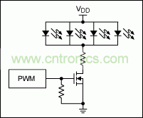 許多顯示屏模塊如今都配有一個集成控制器,用戶可以通過向控制器發(fā)送串行命令,直接設置背光亮度。如果顯示屏模塊未配備集成控制器,還可安裝一個簡單的背光控制執(zhí)行器,控制顯示屏后面用于背光照明的白光LED燈的輸入電流。實現這種控制的一種簡單辦法是:直接給LED串聯一個場效應晶體管(FET),使用PWM信號快速打開、關閉FET (圖5)。然而,也可以利用單一芯片(用于LED控制的MAX1698升壓轉換器)準確、可靠地調節(jié)(圖6),請參考應用筆記3866“Low-power PWM output controls LED brightness”,獲取詳細信息。