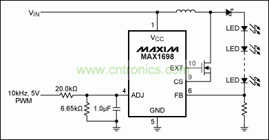 圖6. 基于MAX1698的LED亮度調節(jié)器