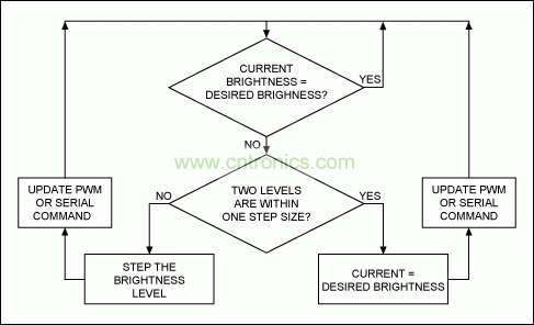 最好不要從一個亮度級直接跳轉到另一個亮度級,而是平滑上調和下調背光亮度,確保不同亮度等級之間無縫過渡。為了達到這一目的,最好采用帶有固定或不同亮度步長、可逐步調節(jié)亮度的定時中斷,也可采用帶有可控制LED輸入電流的PWM值的定時中斷,或者是能夠發(fā)送到顯示屏控制器的串行指令的定時中斷。圖8提供了這種算法的一個示例。