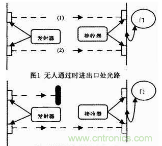 本設(shè)計的改進(jìn)之處是設(shè)計一個具有計數(shù)功能的模塊,我們可以使用對射型光電傳感器,如圖1所示在洗手間的進(jìn)口處設(shè)置兩個發(fā)射源和兩個接收源,當(dāng)有人進(jìn)或者出洗手問的門時,會阻擋光線,如圖2所示,接收處就接收不到設(shè)置光源發(fā)出的光信號,這時接收處的輸出端會發(fā)出一個信號,計數(shù)器就可以通過此信號進(jìn)行計數(shù)。只要計數(shù)器里存儲數(shù)等于一時,系統(tǒng)控制燈亮,大于零時,該系統(tǒng)就會控制燈一直亮著,一旦為零,系統(tǒng)會控制燈延時一小段時間后自動熄滅。由于整個系統(tǒng)初啟動時無法判斷室內(nèi)是否有人,因而我們還會設(shè)置一個簡易開關(guān),供使用者進(jìn)行手控,且為方便使用者能在夜間看到開關(guān)的位置,我們可以采用表面具有夜光性能的材料來做按鍵。光電檢測系統(tǒng)的啟動由光敏傳感器控制。
