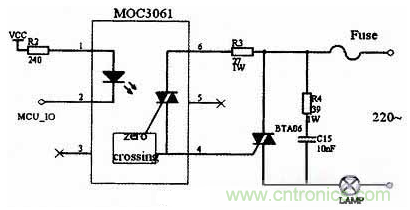 本系統(tǒng)由光電傳感器檢測洗手間內(nèi)是否有人,單片機進(jìn)行計數(shù),當(dāng)N不為零時,單片機會向與MOC3061芯片引腳相連的端口輸送信號,然后通過可控硅來控制燈的開、關(guān)。其中R3是雙向可控硅的門極電阻,當(dāng)可控硅靈敏度較高時,門極阻抗也很高,并上R3可提高抗干擾能力。 39Ω電阻和0.01μF電容組成浪涌吸收電路,防止浪涌電壓損壞雙向可控硅。其電路圖如圖4所示。