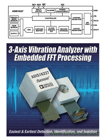 在一些應(yīng)用案例中,相對(duì)簡單的傳感器輸出可能就足夠了,但在另一些應(yīng)用中(例如,通過震動(dòng)分析進(jìn)行狀態(tài)監(jiān)控),則需要增加相當(dāng)多的處理過程才能實(shí)現(xiàn)所需的輸出。圍繞慣性傳感器而構(gòu)建的一個(gè)高集成度器件示例是ADIS16227(見圖2),它是一款完全自治的頻域震動(dòng)監(jiān)控器。此類器件可能不提供相對(duì)簡單的g/mV輸出,而是提供特定應(yīng)用分析。在本例中,其嵌入式頻域處理、512點(diǎn)實(shí)值FFT和片上存儲(chǔ)器能夠識(shí)別各震動(dòng)源并進(jìn)行歸類,監(jiān)控其隨時(shí)間的變化情況,并根據(jù)可編程的閾值做出反應(yīng)。