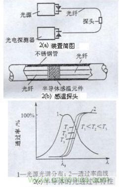 位圖2(a)為半導(dǎo)體吸光型(傳光型)光纖溫度傳感器示意圖。將一根切斷的光導(dǎo)纖維裝在細(xì)鋼管內(nèi),光纖兩端面間夾有一塊半導(dǎo)體感溫薄片(如GaAs或InP),這種半導(dǎo)體感溫薄片透射光強(qiáng)隨被測(cè)溫度而變化。因此,當(dāng)光纖一端輸入一恒定光強(qiáng)的光時(shí),由于半導(dǎo)體感溫薄片透射能力隨溫度變化,光纖另一端接收元件所接受的光強(qiáng)也隨被測(cè)溫度而改變。于是通過測(cè)量光探測(cè)器輸出的電量,便能遙測(cè)到感溫探頭2(b)處的溫度。