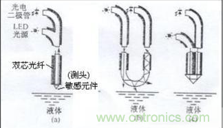 光纖液位傳感器的工作原理如圖3(b)所示。發(fā)光器件射出來(lái)的光通過傳輸光纖送到敏感元件,在敏感元件的球面上,有一部分透過,而其余的光被反射回來(lái)。當(dāng)敏感元件與液體相接觸時(shí),與空氣接觸相比,球面部的光透射量增大,而反射量減少。因此,由反射光量即可知道敏感元件是否接觸液體。反射光量決定于敏感元件玻璃的折射率和被測(cè)定物質(zhì)的折射率。被測(cè)物質(zhì)的折射率越大,反射光量越小。來(lái)自敏感元件的反射光,通過傳輸光纖由受光器件的光電晶體管進(jìn)行光電轉(zhuǎn)換后輸出。敏感元件的反射光量的變化,若以空氣的光量為基準(zhǔn),在水中則為-6-—7dB,在油中為-25—30dB??蓪?duì)反射光量差別很大的水和油等進(jìn)行物質(zhì)判別。
