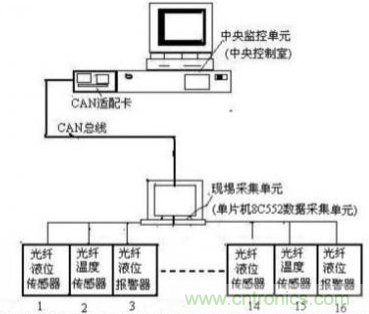 圖5所示可知,監(jiān)測(cè)系統(tǒng)分別由中央控制式的中央監(jiān)控單元和現(xiàn)埸采集單元(或數(shù)據(jù)采集單元)組成?,F(xiàn)埸采集單元對(duì)油罐的液位、溫度信號(hào)進(jìn)行數(shù)據(jù)的實(shí)時(shí)采集,同時(shí)完成數(shù)據(jù)統(tǒng)計(jì)、存貯;中央監(jiān)控單元可以定期或不定期地從現(xiàn)埸采集單元獲取數(shù)據(jù)并完成圖像監(jiān)測(cè)、數(shù)據(jù)統(tǒng)計(jì)、報(bào)表、打印及數(shù)據(jù)庫(kù)管理。而中央監(jiān)控單元和現(xiàn)埸采集單元之間通過CAN總線連接在一起,在這個(gè)網(wǎng)絡(luò)中,中央監(jiān)控單元處于主控位置,而現(xiàn)埸采集單元可以隨時(shí)響應(yīng)中央監(jiān)控單元的命令。其現(xiàn)埸采集單元由單片機(jī)8C552及采集、存儲(chǔ)、顯示、遙控和通信模塊組成,每個(gè)現(xiàn)埸采集單元可與光纖液位傳感器、光纖溫度傳感器及光纖液位報(bào)警器等16個(gè)設(shè)備相接。之所以應(yīng)用CAN總線網(wǎng)絡(luò)結(jié)構(gòu)是內(nèi)由于CAN網(wǎng)絡(luò)具有的方便靈活、突出特性,抗干擾性、可靠性、實(shí)時(shí)性等特點(diǎn)。所有的光纖液位傳感器、光纖溫度傳感器及光纖液位報(bào)警器都可以通過一對(duì)雙絞線串接在一起,節(jié)省了空間、簡(jiǎn)化了布線。