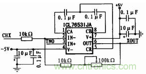 信號(hào)放大電路采用ICL7653斬波穩(wěn)零運(yùn)算放大器來 完成,如圖2所示。ICL7653具有極低的失調(diào)電壓和偏置電流,具有較高的工作穩(wěn)定性和優(yōu)良的高精度放大功能。ICL7653斬波穩(wěn)零使用內(nèi)部時(shí)鐘時(shí), 在CA、CB與CR端之間加上0.1 μF的低泄放、高穩(wěn)定性的聚酯或聚丙烯電容。同時(shí)在雙電源接入端進(jìn)行濾波和去耦處理。