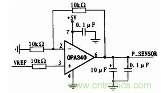 圖5中的輸入為圖4中的參考電壓(VREF)輸出。以低漂移、高穩(wěn)定性運(yùn)放OPA340組成的運(yùn)放電路給傾角傳感器SCA100T提供電源,能保證電源紋波小,工作穩(wěn)定。