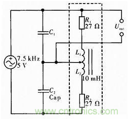 如圖1如果沒有C1和C2為普通半橋電路,虛線框中為電感傳感器的等效電路,傳感器測頭的位移帶動螺線管中鐵芯上下移動,從而改變上下兩個線圈的電感值。將兩線圈等效成純電阻和純電感的串聯(lián),如圖中R1和L1組成上線圈,R2和L2組成下線圈,輸出接在上線圈上。實際傳感器中線圈與輸出的接線不會變,只是通過鐵芯移動來改變電感,所以R1和R2固定不變。