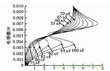 對于半橋時電路II由于希望鐵芯在最下方時回路II諧振,最上方時回路I諧振,因為L1和L2的變化范圍為3~7 mH。L2為7 mH時回路II諧振,L1為7 mH時回路I諧振。按照仿真條件計算C1=C2=65 nF。簡化仿真不妨取C1=C2,在65 nF附近從55~100 nF間隔5 nF進行仿真,觀察電路性能,仿真結(jié)果如圖2所示。