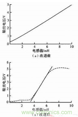 經(jīng)Matlab計算普通半橋在3~7 mH段,電壓變化范圍1.5~3.5 V,電壓對電感的靈敏度為0.5V/mH。線性度近似為1。對圖3(b)采用最小二乘法擬合直線后,在3.8~6.3 mH段,輸出電壓的變化范圍0.77~4.39 V。線性度可達2.39%,靈敏度為1.448 V/mH。
