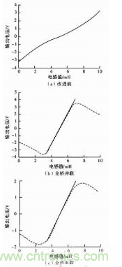 普通全橋在3.8~6.3 mH段,電壓變化范圍為-1.2~+1.3 V,電壓對電感的靈敏度為1 V/mH。線性度近似為1.38。對圖4(b)和圖4(c)使用Matlab進行最小擬合直線如圖所示,在3.8~6.3 mH段,并聯(lián)方式輸出電壓的變化范圍為-2.66~+2.66V,靈敏度為2.130V/mH線性度可達1.68%。串聯(lián)方式的輸出電壓范圍約為-1.25~+1.25V,靈敏度約為2.130V/mH線性度可達1.33%。