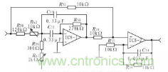 該低通濾波電路主要濾除干擾信號,并且要求幅頻特性中有最大的平坦區(qū),為此選用四階壓控電壓源巴特沃斯But-terworth型濾波器。壓控電壓源型電 路結(jié)構(gòu)的濾波器特點是使用元件少,對放大器要求不高。在本級電路中,電阻器誤差小于0.01%,電容器誤差小于O.1%。由于電路中所選電阻值不在電阻序 列之內(nèi),故實際電路中,用多個電阻串聯(lián)以求得到所需的阻值,電路中電容必須經(jīng)過嚴(yán)格挑選。電路原理如圖5所示。10 Hz,0.6 Hz四階Butterworth LPF電路的元件值如表1所示。