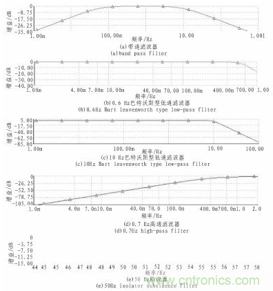 根據(jù)前面的設(shè)計電路,對0.05~1O Hz帶通濾波器、10 Hz和0.6 Hz的低通濾波器、0.7 Hz的高通濾波器及50 Hz的陷波器電路中各元件進行估值并通過MulTIsim仿真且反復(fù)調(diào)試,并通過電路試驗,獲得了較為理想的幅頻特性,各部分電路的幅頻特性測試結(jié)果如圖 8所示。從圖8中可以看出,0.05~1O Hz帶通濾波器、10 Hz和0.6 Hz低通濾波器、0.7 Hz的高通濾波器都具有平坦的3 dB通頻帶,50 Hz陷波器的Q值大于5。