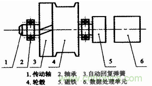 基于磁敏角度技術(shù)的拉線式位移傳感器的功能是將拉線的機(jī)械位移換成可以計(jì)量、記錄或傳送的電信號(hào),主要由自動(dòng)回復(fù)彈簧、輪轂、磁鐵以及數(shù)據(jù)處理單元等部分構(gòu)成,結(jié)構(gòu)如圖1所示。