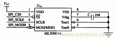 由于串行通信的輸出信號(hào)直接來(lái)自于MLX90316的內(nèi)部DSP輸出,SPI輸出模式更穩(wěn)定,誤差更小,并且具有更高的抗干擾能力。在本設(shè)計(jì)中,選用SPI接口,具體的硬件接口連接電路如圖3所示。在圖3中,MLX90316的SPI三根線與ARM LPC2136的SPl0口連接。SPI(SerialProtocol InterIace)總線接口是一種同步串行外設(shè)接口。這是一個(gè)4根信號(hào)線的串行接口協(xié)議,包括主、從兩種模式。這4根信號(hào)線分別是:時(shí)鐘線(SCK)、數(shù)據(jù)輸入線(MISO)、數(shù)據(jù)輸出線(MOSI)和從設(shè)備使能線(SS)。