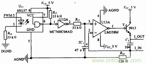 數(shù)據(jù)處理單元具備一路可控4~20 mA的電流輸出,用于現(xiàn)場(chǎng)指示儀表的驅(qū)動(dòng)。具體的連接電路如圖4所示。其中PWM2連接ARM的PWM2引腳,PWM信號(hào)用于控制光耦的導(dǎo)通與截止,反相器主要用于波形的整定,根據(jù)磁敏角度和位移關(guān)系,建立數(shù)學(xué)模型,計(jì)算出PWM的占空比,從而達(dá)到電流大小調(diào)節(jié)的目的。