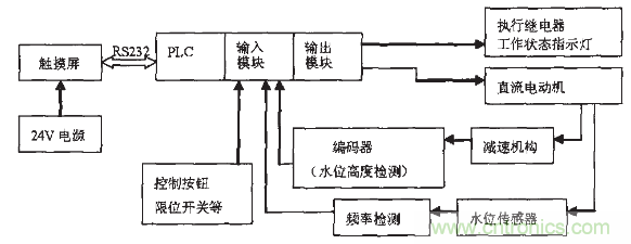 作為主電機(jī)的直流電動(dòng)機(jī)由PLC進(jìn)行控制,電機(jī)實(shí)現(xiàn)PID調(diào)速,電機(jī)的輸出通過減速機(jī)構(gòu)與執(zhí)行機(jī)構(gòu)相連,最后帶動(dòng)細(xì)鋼管在水箱中上下移動(dòng)來按檢測要求控制管內(nèi)水位高度的準(zhǔn)確變化,通過編碼器實(shí)現(xiàn)水位高度變化的實(shí)時(shí)檢測,頻率的實(shí)時(shí)檢測由PLC的高速計(jì)數(shù)器來完成??刂泼畹妮斎虢覲LC的輸入端,PLC的輸出端接執(zhí)行繼電器和工作狀態(tài)指示燈等。