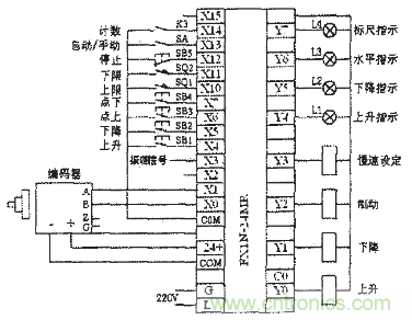 圖2為PLC控制系統(tǒng)硬件接線圖。輸入X0~X1為編碼器的A、B相輸出脈沖信號(hào),X3為振蕩頻率信號(hào),X4~X14為按鈕、選擇開關(guān)、限位開關(guān)和計(jì)數(shù)開始等信號(hào),輸出Y0~Y7分別控制繼電器、信號(hào)指示燈等。