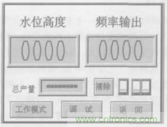 整個(gè)畫面由兩部分組成:一部分為顯示畫面,主要包括系統(tǒng)畫面、測試系統(tǒng)的運(yùn)行狀態(tài)、水位高度顯示、振蕩頻率輸出、顯示每天的總產(chǎn)量等畫面,如圖4所示;另一部分為參數(shù)設(shè)定畫面,主要用來設(shè)定工作模式、水位分段上升、下降的數(shù)值等,如圖5所示。