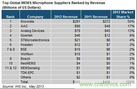 隨著市場(chǎng)的發(fā)展,MEMS麥克風(fēng)市場(chǎng)的格局也在不斷的變化中。在HIS最新的分析報(bào)告顯示,樓氏電子繼續(xù)主宰MEMS麥克風(fēng)市場(chǎng),2012年以2.9億美元營(yíng)收傲視所有其它供應(yīng)商,樓氏一家營(yíng)收已實(shí)際占到整個(gè)MEMS麥克風(fēng)市場(chǎng)的一半。中國(guó)AAC和歌爾聲學(xué)排名第二和第四,ST異軍突起,擠進(jìn)前五。