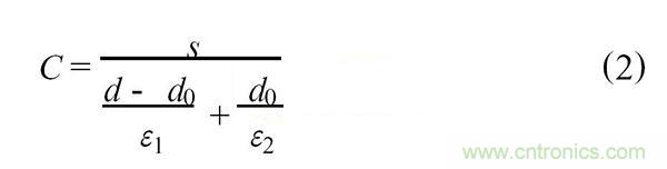 式中,S為極板相互遮蓋面積,單位為m2;d為兩平行板間的距離,單位為m;ε為極板間介質的介電常數(shù);εr極板間介質的相對介電常數(shù);ε0真空的介電常數(shù)。從上式可以看出,當d小時可使電容量增大,而使靈敏度增加,但d過小容易引起電容器擊穿,一般我們可以采取在極板間放置云母來改善,此時電容C為兩電容串聯(lián),可寫成: