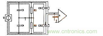 第三個問題是分布電容的影響。由于電容傳感器一個很關鍵的問題是分布電容電容量與傳感器電容量相比不僅不能忽略,而且影響還極其嚴重,其后果是造成傳輸效率降低、靈敏度下降、測量誤差增加及穩(wěn)定性變差。近幾年來,對此問題有了新的解決途徑。其中“整體屏蔽法”就是一例,以差動電容傳感器為例,說明整體屏蔽法,在下圖中,CX1、CX2為差動電容,U為電源,A為放大器,整體屏蔽法是把整個電橋(包含電源電纜等)一起屏蔽起來,設計的關鍵點在于接地點的合理設置。采用把接地點放在兩個平衡電阻R1、R2之間與整體屏蔽共地,這樣,傳感器公用極板與屏蔽之間的分布電容C1與放大器的輸入阻抗并聯(lián),從而可把C1視作放大器的輸入電容。由于放大器的輸入阻抗有極大值,C1的并聯(lián)也不希望存在,但它只影響靈敏度而已,另外兩個分布電容C3、C4并聯(lián)在橋臂R1、R2上,會影響電橋的初始平衡和整體靈敏度,并不影響電橋的正常工作。因此,分布參數(shù)對傳感器電容的影響基本消除,整體屏蔽法是解決電容傳感器分布電容問題的很好方法,缺點是使結構復雜。